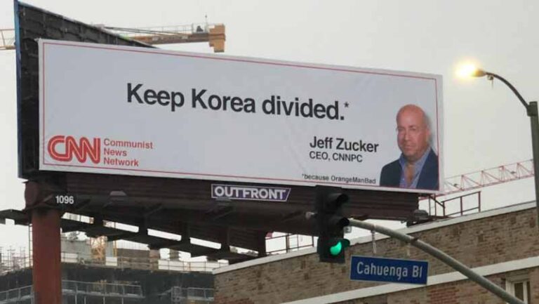 In the billboard that appeared in front of CNN’s Hollywood headquarters, the group referred to CNN as “Communist News Network,” came up with the phrase “Keep Korea divided” with an asterisk that said, “because OrangeManBad.” It also showed an image of Jeff Zucker, whose title was “CEO, CNNPC”. a reference to the “non-playable character” meme that has described liberals as robotic.